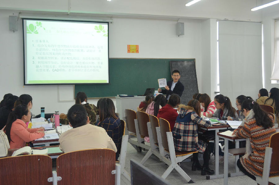 刘教授依旧提前20分钟到课堂,与同学们交流最近学习中遇到的困难。示范课上,刘教授首先了解同学们课前作业的完成情况。在分组汇报模纹试制过程中出现的问题后,同学们带着疑问进入了今天要完成的配色模纹织物设计与试制的任务。接着,刘教授以年度织物流行趋势导入课堂,提出本次课的六项技能要求,向同学们介绍本次课的知识准备,展示常见的模纹纹样。课程中最精彩的部分莫过于“学做训练”模块了。刘教授首先引导学生仿真模拟接到企业订单时应该要做的工作,并一边引导学生思考,一边使用PPT动画演示完成“已知配色花纹,确定色纱排列与组织图”绘图方法的五个步骤。在确定好纱线的颜色、必然经浮点、必然纬浮点和待定浮点后,可以据此组成多种组织图可供选择。同学们听讲认真,积极交流对试制中出现问题的解决方法,享受到了发现问题、分析问题、解决问题的快乐,都迫不及待地参与到模拟练习中,在自己完成了七种配色模纹图后,同学们都非常有成就感。