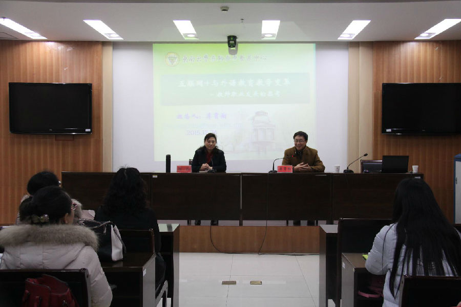 李教授从三个方面与我校教师进行了深入交流:一是互联网+对当代教育的影响;二是互联网时代英语教师如何应对挑战;三是在信息化环境下如何根据认知特点,提高学生英语口语表达能力。李教授深刻而独到的见解,引起了与会教师对“教育信息化”和“信息化教育”这个热门话题的积极思索,对指导英语教师将“互联网+”引入课堂教学和规划新形势下个人职业发展都起到了推动作用。